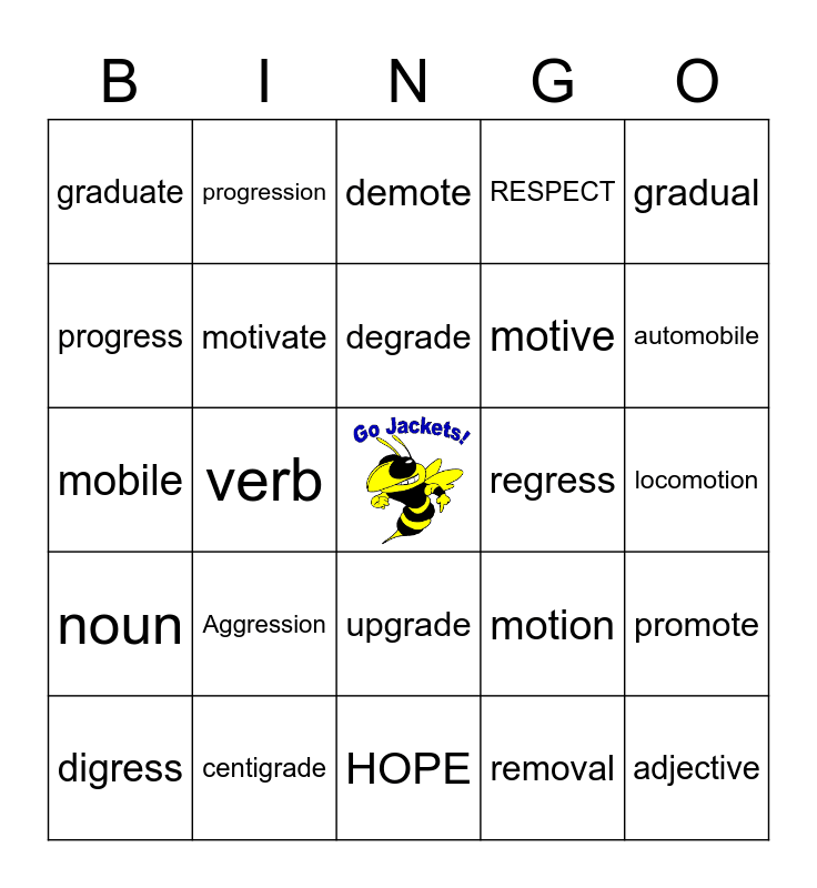 This bingo card has a free space and 24 words: Aggression, centigrade, degrade, digress, gradual, graduate, progress, progression, regress, upgrade, motive, mobile, motion, promote, motivate, removal, locomotion, demote, automobile, verb, adjective, noun, RESPECT and HOPE.