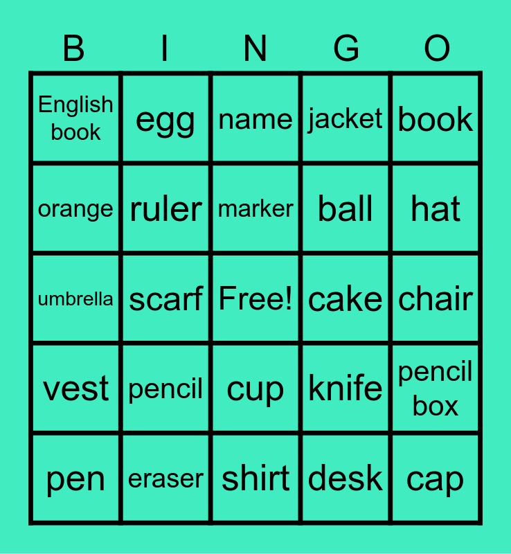 This bingo card has a free space and 24 words: pencil, eraser, marker, pen, book, English book, orange, egg, cake, cup, ball, umbrella, knife, pencil box, ruler, desk, chair, name, hat, scarf, cap, vest, jacket and shirt.
