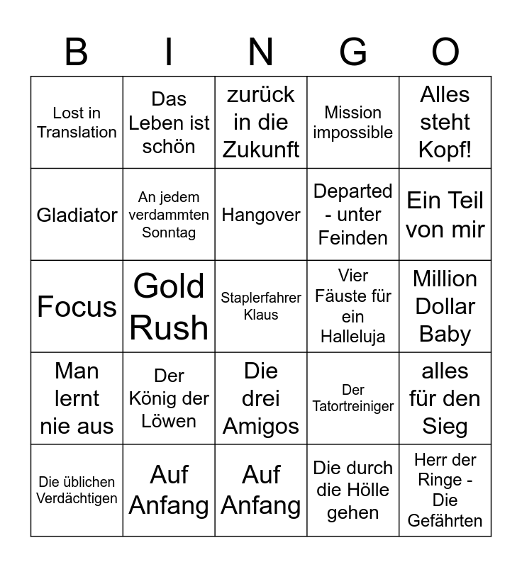 This bingo card has a free space and 35 words: Quo Vadis, Aus alt mach neu, 28 days later, An jedem verdammten Sonntag, Die drei Amigos, Mission impossible, Gladiator, Hasta la vista, baby, Hangover, der prozess, Focus, Alles steht Kopf!, sag niemals nie, Sieben, Lost in Translation, Vier Fäuste für ein Halleluja, Die durch die Hölle gehen, Gold Rush, Man lernt nie aus, Herr der Ringe - Die Gefährten, Der Tatortreiniger, Die üblichen Verdächtigen, alles für den Sieg, Auf Anfang, zurück in die Zukunft, Ein Teil von mir, Ziemlich beste Freunde, Eine unerwartete Reise, Departed - unter Feinden, Million Dollar Baby, (Terminator 2) - Tag der Abrechnung, Auf Anfang, Der König der Löwen, Das Leben ist schön and Das Beste kommt zum Schluss.