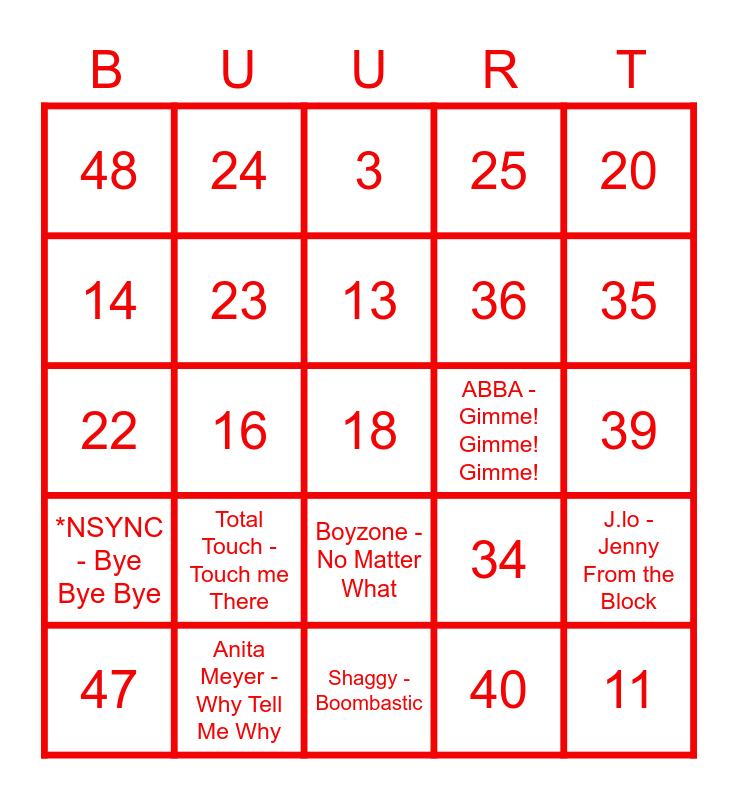 This bingo card has 75 words: 1, 2, 3, 4, 5, 6, 7, 8, 9, 10, 11, 12, 13, 14, 15, 16, 17, 18, 19, 20, 21, 22, 23, 24, 25, 26, 27, 28, 29, 30, 31, 32, 33, 34, 35, 36, 37, 38, 39, 40, 41, 42, 43, 44, 45, 46, 47, 48, 49, 50, The Backstreetboys - Quit Playing Games With My Heart, Boyzone - No Matter What, Cher - Believe, Culture Beat - Mr Vain, Haddaway - What is Love, The Party Animals - Have You Ever Been Mellow, Robbie Williams - Angels, SNAP - Rhythm is a Dancer, The Spice Girls - Stop, Destiny’s Child - Survivor, Total Touch - Touch me There, The Vengaboys - We’re Going To Ibiza, Natasha Bedingfield - Unwritten, Rick Astley - Never Gonna Give You Up, A-ha - Take on Me, ABBA - Gimme! Gimme! Gimme!, Britney Spears - …Baby One More Time, Sisqo - Thong Song, Ricky Martin - Livin’ la Vida Loca, J.lo - Jenny From the Block, *NSYNC - Bye Bye Bye, Anita Meyer - Why Tell Me Why, Andre Hazes - Bloed, Zweet en Tranen, Shaggy - Boombastic and TLC - No Scrubs.