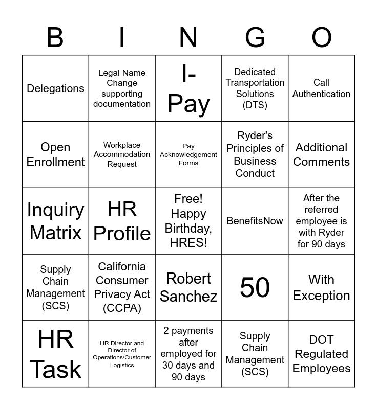 This bingo card has a free space and 24 words: California Consumer Privacy Act (CCPA), HR Director and Director of Operations/Customer Logistics, Pay Acknowledgement Forms, HR Task, Call Authentication, Delegations, Open Enrollment, Legal Name Change supporting documentation, BenefitsNow, Robert Sanchez, Ryder's Principles of Business Conduct, Inquiry Matrix, 50, With Exception, Workplace Accommodation Request, Supply Chain Management (SCS), After the referred employee is with Ryder for 90 days, I-Pay, Additional Comments, HR Profile, DOT Regulated Employees, Supply Chain Management (SCS), Dedicated Transportation Solutions (DTS) and 2 payments after employed for 30 days and 90 days.