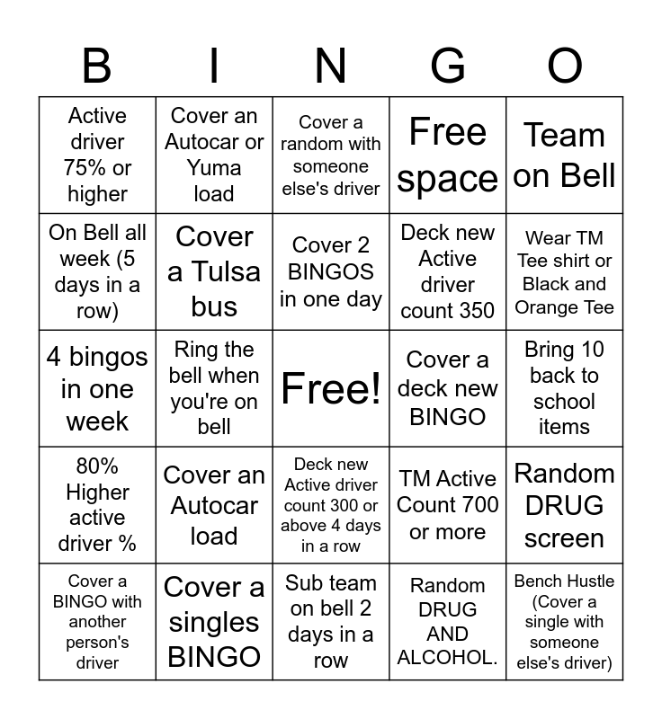 This bingo card has a free space and 24 words: Cover an Autocar load, Cover a singles BINGO, Cover 2 BINGOS in one day, Cover a BINGO with another person's driver, Team on Bell, Active driver 75% or higher, On Bell all week (5 days in a row), Cover an Autocar or Yuma load, Cover a deck new BINGO, Deck new Active driver count 300 or above 4 days in a row, Deck new Active driver count 350, 4 bingos in one week, TM Active Count 700 or more, Random DRUG screen, Cover a Tulsa bus, Random DRUG AND ALCOHOL., Bring 10 back to school items, Cover a random with someone else's driver, Wear TM Tee shirt or Black and Orange Tee, Ring the bell when you're on bell, Bench Hustle (Cover a single with someone else's driver), 80% Higher active driver %, Free space and Sub team on bell 2 days in a row.