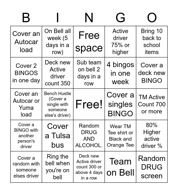 This bingo card has a free space and 24 words: Cover a Tulsa bus, Ring the bell when you're on bell, Sub team on bell 2 days in a row, Cover a random with someone elses driver, Bring 10 back to school items, Cover an Autocar load, Cover 2 BINGOS in one day, On Bell all week (5 days in a row), Cover a singles BINGO, Random DRUG AND ALCOHOL., 4 bingos in one week, Cover an Autocar or Yuma load, Wear TM Tee shirt or Black and Orange Tee, 80% Higher active driver %, Deck new Active driver count 350, Team on Bell, TM Active Count 700 or more, Free space, Cover a deck new BINGO, Bench Hustle (Cover a single with someone else's driver), Random DRUG screen, Cover a BINGO with another person's driver, Active driver 75% or higher and Deck new Active driver count 300 or above 4 days in a row.