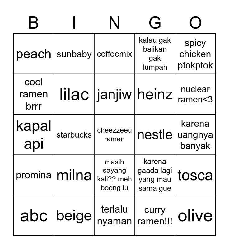 This bingo card has a free space and 24 words: milna, beige, janjiw, abc, spicy chicken ptokptok, peach, cool ramen brrr, sunbaby, nestle, masih sayang kali?? meh boong lu, heinz, kapal api, karena gaada lagi yang mau sama gue, tosca, lilac, curry ramen!!!, karena uangnya banyak, coffeemix, nuclear ramen<3, starbucks, olive, promina, kalau gak balikan gak tumpah and terlalu nyaman.