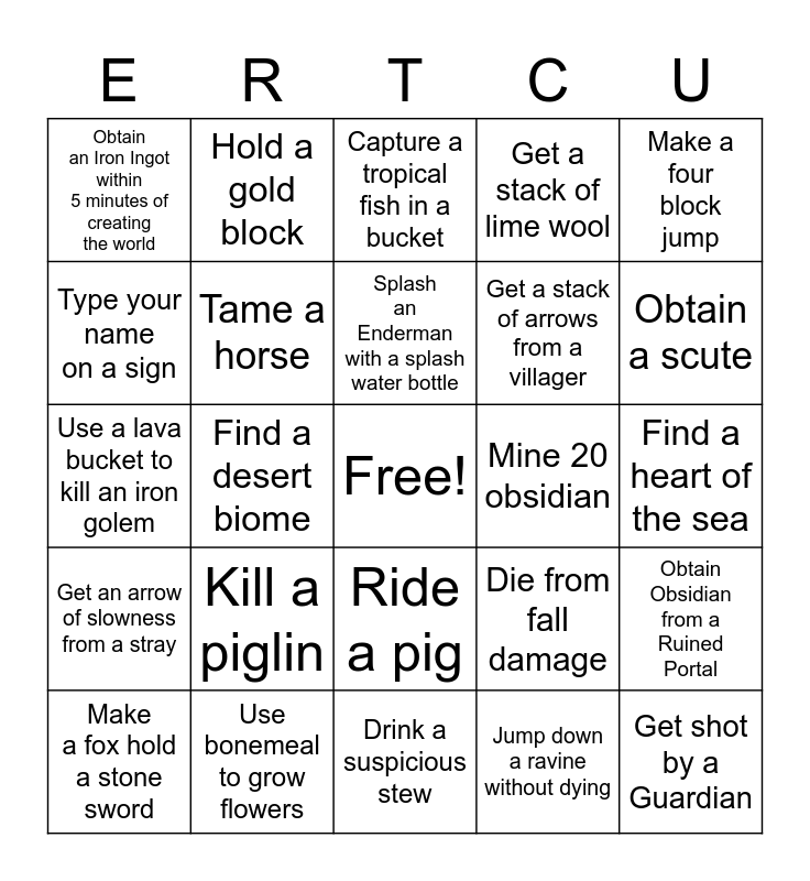 This bingo card has a free space and 24 words: Kill a piglin, Use bonemeal to grow flowers, Splash an Enderman with a splash water bottle, Make a fox hold a stone sword, Make a four block jump, Obtain an Iron Ingot within 5 minutes of creating the world, Type your name on a sign, Hold a gold block, Mine 20 obsidian, Ride a pig, Get a stack of arrows from a villager, Use a lava bucket to kill an iron golem, Die from fall damage, Obtain Obsidian from a Ruined Portal, Tame a horse, Jump down a ravine without dying, Find a heart of the sea, Capture a tropical fish in a bucket, Obtain a scute, Find a desert biome, Get shot by a Guardian, Get an arrow of slowness from a stray, Get a stack of lime wool and Drink a suspicious stew.
