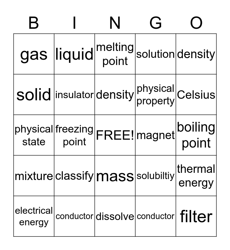This bingo card has a free space and 24 words: classify, conductor, density, electrical energy, density, gas, solid, liquid, magnet, mass, physical property, physical state, solubiltiy, thermal energy, insulator, conductor, boiling point, melting point, Celsius, freezing point, filter, mixture, solution and dissolve.