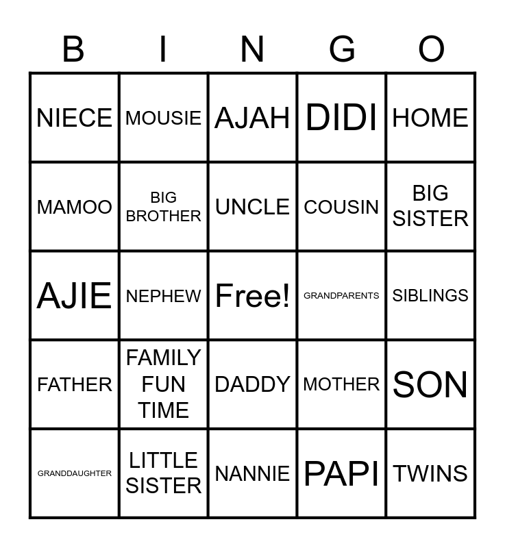 This bingo card has a free space and 29 words: MAMMY, LITTLE SISTER, AJAH, AUNTY, HOME, NIECE, BIG BROTHER, UNCLE, GRANDPARENTS, SON, GRANDDAUGHTER, NEPHEW, PAPI, TWINS, AJIE, GRANDSON, NANNIE, MOTHER, BIG SISTER, FATHER, FAMILY FUN TIME, DAUGHTER, COUSIN, SIBLINGS, MAMOO, MOUSIE, DADDY, DIDI and MOUSA.
