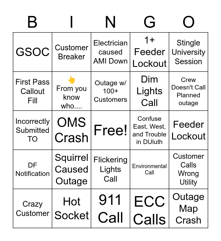 This bingo card has a free space and 24 words: Squirrel Caused Outage, Hot Socket, Outage w/ 100+ Customers, Crazy Customer, Stingle University Session, GSOC, First Pass Callout Fill, Customer Breaker, Confuse East, West, and Trouble in DUluth, Flickering Lights Call, Dim Lights Call, Incorrectly Submitted TO, Environmental Call, Customer Calls Wrong Utility, 👆 From you know who...., ECC Calls, Feeder Lockout, Electrician caused AMI Down, Crew Doesn't Call Planned outage, OMS Crash, Outage Map Crash, DF Notification, 1+ Feeder Lockout and 911 Call.