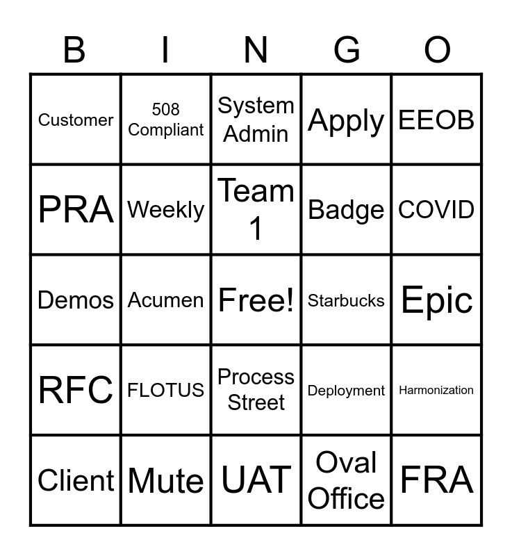 This bingo card has a free space and 72 words: 46, 508 Compliant, Acumen, Air Force One, AMG, App Directory, Apply, Backlog, Badge, Campus, Client, Confluence, COVID, Customer, Dataloader, Demos, Deployment, EEOB, EOP, Epic, FLOTUS, FRA, Harmonization, ICTIME, Inauguration, Jira, Kanban, Lunch & Learn, Marine One, Masks, Mute, NEOB, One Pager, Orgs, Oval Office, PIV, Placards, POTUS, PRA, Priority, Process Street, Production, Quarantini, Regression, Requirements, RFC, Salesforce, Secret Service, Skype, Slack, SPIKE, Stand Down, Stand Up, Starbucks, Story, Surge, System Admin, Team 1, Team 2, Team 3, Token, Tours, Transition, UAT, USTR, WAVES, Weekly, White House, Wolf Pack, Work Day, WorkBench and Zoom.