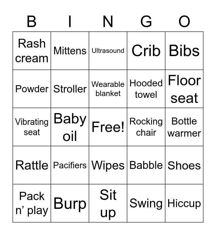 This bingo card has a free space and 64 words: Onesie, Hat, Socks, Shoes, Gown, Swaddle, Mittens, Booties, Wearable blanket, Diapers, Wipes, Bottles, Bottle warmer, Bibs, Wash, Powder, Baby oil, Rash cream, Lotion, Hooded towel, Pacifiers, Rattle, Crib, Mobile, Books, Teething rings, Bag, Changing table, Sippy cups, Formula, Food, High chair, Walker, Bouncer, Floor seat, Pack n’ play, Playpen, Swing, Car seat, Stroller, Vibrating seat, Rocking chair, Bassinet, Cry, Smile, Hiccup, Burp, Nurse, Babble, Giggle, Suck thumb, Roll over, Sit up, Crawl, Walk, Monitor, Ultrasound, Pink, Bath time, Stork, Lullaby, Milk, Newborn and Teddy bear.
