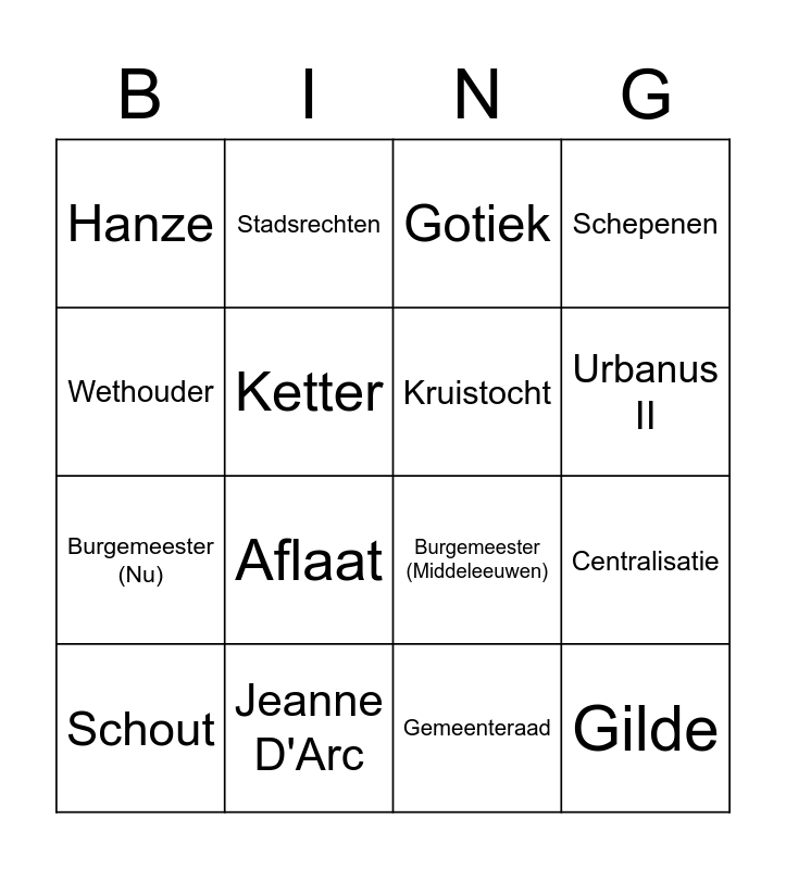 This bingo card has 18 words: Aflaat, Gilde, Gotiek, Hanze, Burgemeester (Middeleeuwen), Schepenen, Schout, Stadsrechten, Urbanus II, Burgemeester (Nu), Gemeenteraad, Wethouder, Centralisatie, Ketter, Kruistocht, Floris V, Jeanne D'Arc and Lodewijk XI.