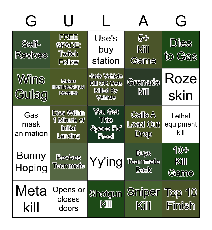 This bingo card has a free space and 49 words: FREE SPACE: RT Stream on Twitter, Top 10 Finish, Stotch Grabs Another Beverage, Shotgun Kill, Revives Teammate, Curses at Teammate, FREE SPACE: Twitch Follow, FREE SPACE: Twitch Sub, Wins Gulag, Loses Gulag, Makes Horrible/Stupid Decision, 5+ Kill Game, 10+ Kill Game, Buys Teammate Back, Parachute Kill, Redeem Channel Points/Tegridy, Gets Vehicle Kill OR Gets Killed By Vehicle, Calls A Load Out Drop, Completes Bounty Contract, Dies to Gas, Dies Within 1 Minute of Initial Landing, Sniper Kill, Self-Revives, Grenade Kill, Activates contract, Roze skin, Meta kill, Collects free Loadout, Yy'ing, Bunny Hoping, Pops Dead Silence, Completes Self revive, Off meta kill, Try harding, Opens or closes doors, 1st place, Use's amunisation box, Use's armour box, Lethal equipment kill, Floor loot kill, Use's parachute, Use's killstreak, Use's zipline, Gets ran over, Gas mask animation, Use's buy station, Camping, 5 kills and Drives vehicles.