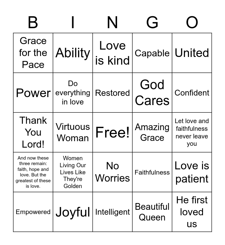 This bingo card has a free space and 24 words: Women Living Our Lives Like They're Golden, Joyful, Restored, Empowered, United, Grace for the Pace, Power, Ability, Amazing Grace, No Worries, God Cares, Thank You Lord!, Faithfulness, Love is patient, Do everything in love, Beautiful Queen, Let love and faithfulness never leave you, Love is kind, Confident, Virtuous Woman, He first loved us, And now these three remain: faith, hope and love. But the greatest of these is love., Capable and Intelligent.