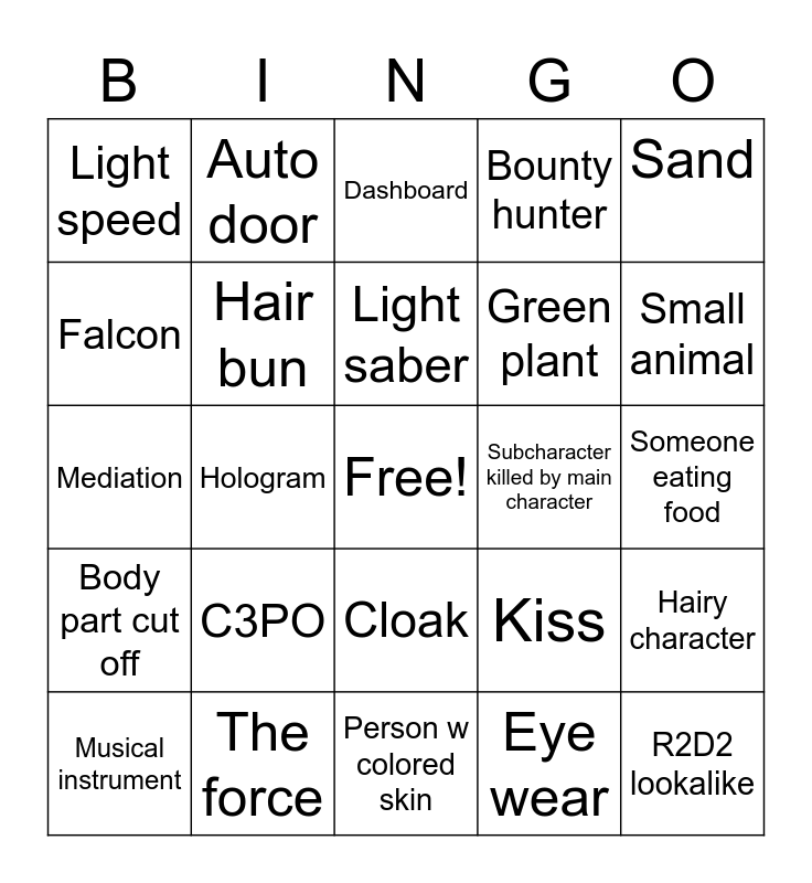 This bingo card has a free space and 24 words: C3PO, The force, Light saber, Musical instrument, Sand, Light speed, Falcon, Auto door, Subcharacter killed by main character, Cloak, Green plant, Mediation, Kiss, Hairy character, Hair bun, Eye wear, Someone eating food, Dashboard, Small animal, Hologram, R2D2 lookalike, Body part cut off, Bounty hunter and Person w colored skin.