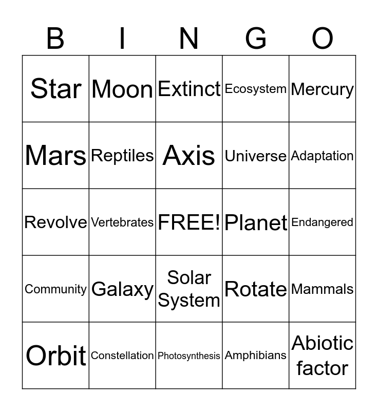 This bingo card has a free space and 24 words: Galaxy, Constellation, Axis, Orbit, Mercury, Star, Mars, Moon, Planet, Solar System, Universe, Revolve, Rotate, Mammals, Reptiles, Amphibians, Endangered, Extinct, Adaptation, Vertebrates, Abiotic factor, Community, Ecosystem and Photosynthesis.