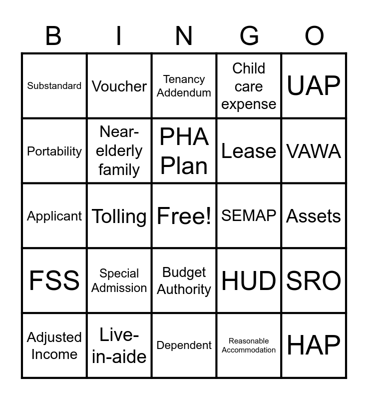 This bingo card has a free space and 34 words: VPS, Utilities, Inspection, Biennial, Assets, Portability, Near-elderly family, Dependent, Lease, HAP, Applicant, Voucher, Reasonable Accommodation, Contract Rent, FSS, Tolling, Budget Authority, SEMAP, SRO, Adjusted Income, Live-in-aide, Medical Expense, Child care expense, VAWA, Contract Rent, Special Admission, Tenancy Addendum, Participant, UAP, Substandard, Iyana, PHA Plan, HUD and Low Poverty.