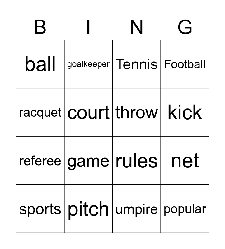 This bingo card has 16 words: pitch, net, Tennis, ball, referee, goalkeeper, rules, umpire, racquet, court, sports, Football, game, kick, throw and popular.