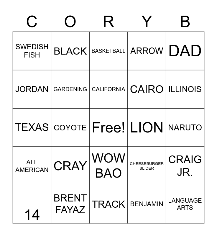 This bingo card has a free space and 24 words: 14, CRAY, CALIFORNIA, BENJAMIN, DAD, SWEDISH FISH, BLACK, BASKETBALL, LION, NARUTO, TEXAS, GARDENING, CHEESEBURGER SLIDER, CRAIG JR., JORDAN, BRENT FAYAZ, TRACK, ARROW, ILLINOIS, ALL AMERICAN, COYOTE, WOW BAO, CAIRO and LANGUAGE ARTS.