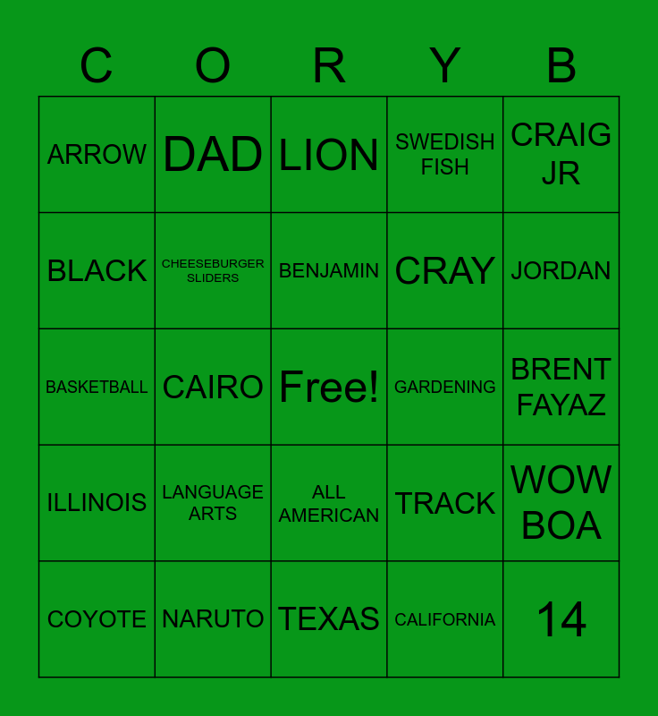This bingo card has a free space and 24 words: COYOTE, LANGUAGE ARTS, BENJAMIN, CALIFORNIA, CRAIG JR, ARROW, DAD, LION, GARDENING, BRENT FAYAZ, BASKETBALL, CHEESEBURGER SLIDERS, TRACK, WOW BOA, BLACK, NARUTO, TEXAS, SWEDISH FISH, JORDAN, ILLINOIS, CAIRO, ALL AMERICAN, CRAY and 14.