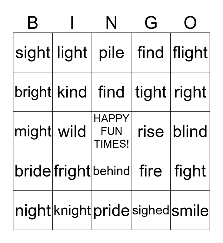 This bingo card has a free space and 24 words: fright, knight, find, night, flight, sight, bright, light, rise, behind, tight, might, fire, fight, kind, sighed, blind, pile, right, wild, smile, bride, find and pride.