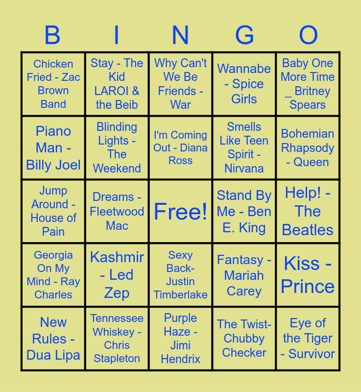 This bingo card has a free space and 39 words: Telephone - Lady Gaga/Beyoncé, Beat it - Michael Jackson, Light my Fire - The Doors, Blinding Lights - The Weekend, New Rules - Dua Lipa, Sexy Back- Justin Timberlake, I'm Coming Out - Diana Ross, Love Yourself - The Bieb, Baby One More Time _ Britney Spears, Georgia On My Mind - Ray Charles, Dreams - Fleetwood Mac, Wannabe - Spice Girls, Eye of the Tiger - Survivor, Help! - The Beatles, Stand By Me - Ben E. King, Kashmir - Led Zep, My House - Kidz Bop, Chicken Fried - Zac Brown Band, Happy - Pharrell Williams, Fantasy - Mariah Carey, Piano Man - Billy Joel, Purple Haze - Jimi Hendrix, Smells Like Teen Spirit - Nirvana, Bohemian Rhapsody - Queen, I Can't Get No Satisfaction - Rolling Stones, Hotel California - The Eagles, What's Goin' On - Marvin Gaye, You've Lost That Lovin' Feeling - The Righteous Brothers, Good Vibrations - Marky Mark, Stay - The Kid LAROI & the Beib, Bad Habits - Ed Sheeran, Good 4 U - Olivia Rodrigo, Why Can't We Be Friends - War, Tennessee Whiskey - Chris Stapleton, The Twist- Chubby Checker, ABC - The Jackson 5, Kiss - Prince, Jump Around - House of Pain and Yeah! - Usher.