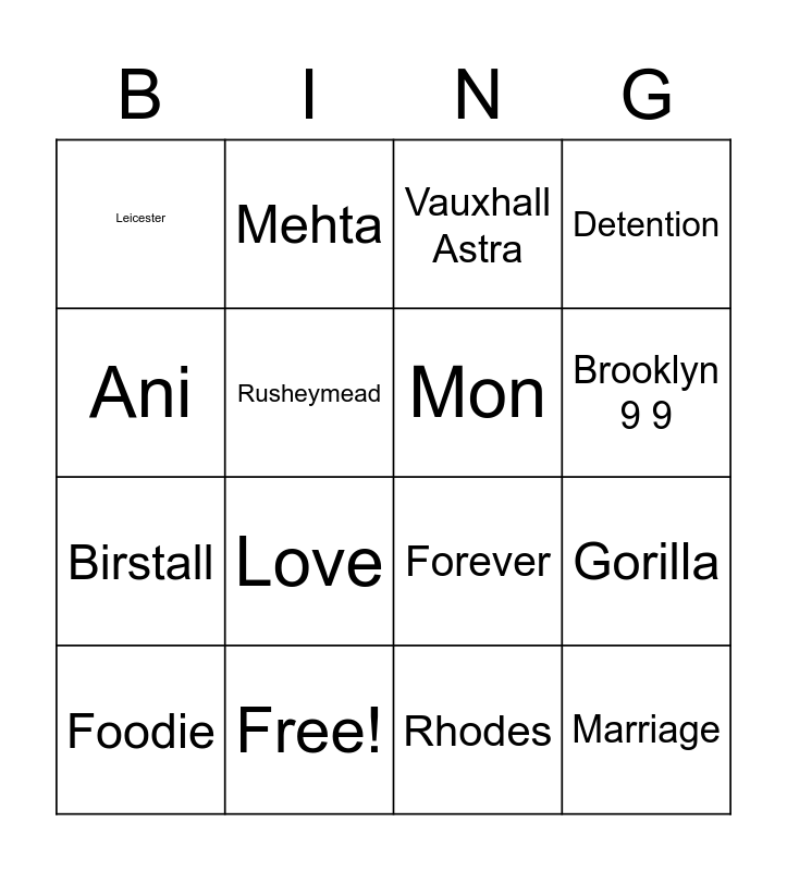 This bingo card has 31 words: Gazz, Mcdonalds, Gorilla, Barcelona, Leicester, Vauxhall Astra, Mon, Cricket, Free!, Soar Valley College, Rhodes, Foodie, Dominos, Teacher, Love, Mars Bar, Pembrokeshire, Mo-nil, Marriage, Indian, Ani, Rusheymead Secondary School, Na Na Nai, Mehta, Birstall, Rusheymead, Detention, Forever, Perfect Match, Brooklyn 9 9 and White Collar.