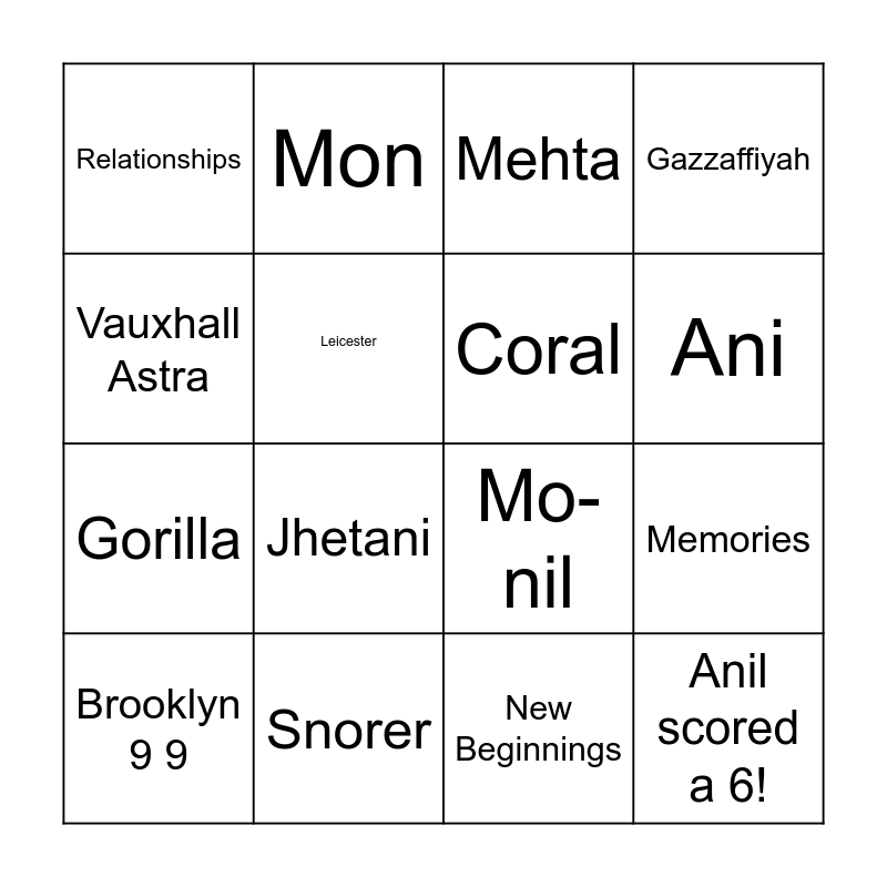 This bingo card has 27 words: Gazz, Mcdonalds, Gorilla, Monzy Malone, Leicester, Mehta, Mon, Anil scored a 6!, Snorer, Netflix, Mo-nil, Gazzaffiyah, Marriage, Sas & Sasra, Jhetani, Mars Bar, Coral, Ani, Birstall, Relationships, New Beginnings, Happiness, Memories, Brooklyn 9 9, White Collar, Vauxhall Astra and Laughter.