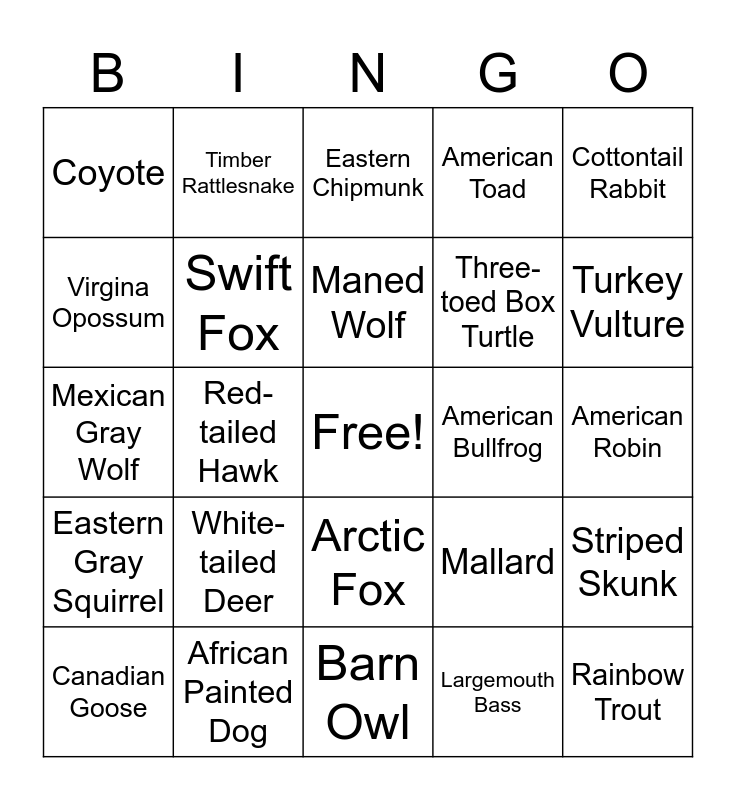 This bingo card has a free space and 40 words: American Red Wolf, Mexican Gray Wolf, Fennec Fox, Swift Fox, African Painted Dog, Arctic Fox, Maned Wolf, Red Fox, Cottontail Rabbit, Eastern Gray Squirrel, Red-tailed Hawk, American Toad, Rainbow Trout, American Robin, American Bullfrog, White-tailed Deer, Raccoon, Coyote, North American River Otter, Eastern Chipmunk, Striped Skunk, Largemouth Bass, Three-toed Box Turtle, Virgina Opossum, Ozark Hellbender, Bobcat, Bald Eagle, Garter Snake, Alligator Snapping Turtle, Green Tree Frog, Five-lined Skink, Canadian Goose, River Otter, Mallard, Turkey Vulture, Barn Owl, Painted Turtle, Rat Snake, Timber Rattlesnake and Spotted Salamander.