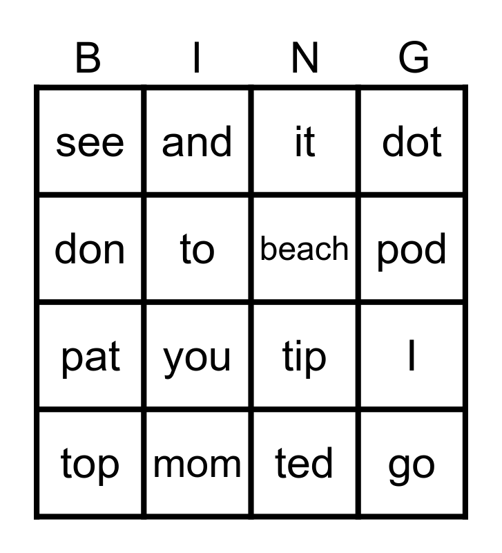 This bingo card has 20 words: I, can, it, we, top, don, mom, see, pat, and, you, tip, to, go, beach, on, pod, dot, ted and like.