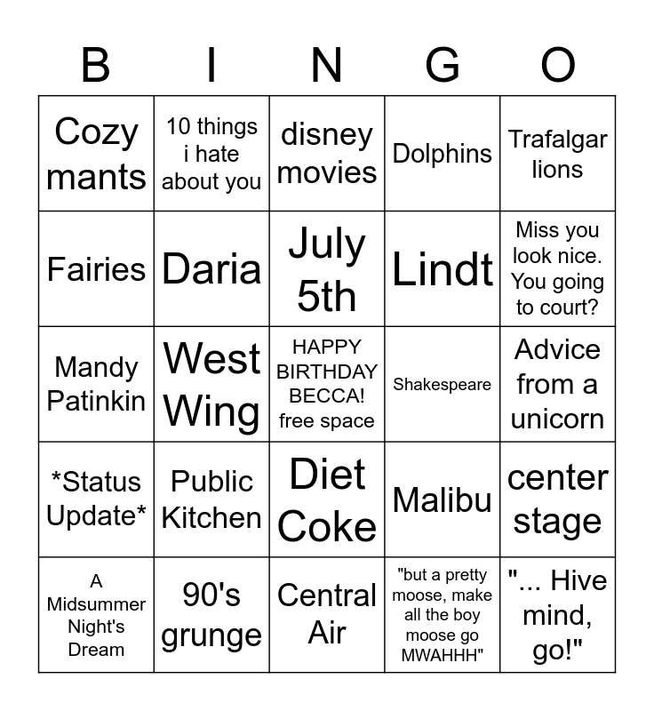 This bingo card has a free space and 39 words: Blue, Tootsie Rolls, Hufflepuff, Daria, A Midsummer Night's Dream, Diet Coke, July 5th, Sangria, Trafalgar lions, *Status Update*, West Wing, Dolphins, "... Hive mind, go!", Advice from a unicorn, Shakespeare, Public Kitchen, Newsies, Cozy mants, chocolate covered strawberries, Malibu, Fairies, Central Air, Lindt, Miss you look nice. You going to court?, Crew Black, "everybody loves a good jazz square", meletharb's hot fudge, california pizza kitchen, Toyota Corolla, 10 things i hate about you, iPhone 5s, purple, disney movies, 90's grunge, "but a pretty moose, make all the boy moose go MWAHHH", sunblock, center stage, Mandy Patinkin and "the thEAtre".