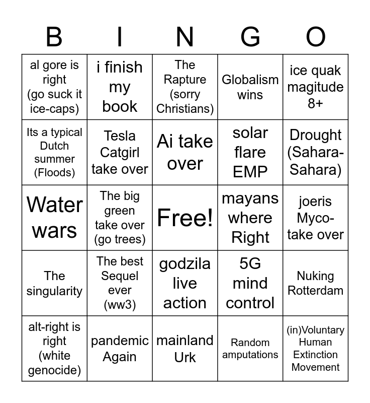 This bingo card has a free space and 24 words: The best Sequel ever (ww3), pandemic Again, Ai take over, alt-right is right (white genocide), ice quak magitude 8+, al gore is right (go suck it ice-caps), Its a typical Dutch summer (Floods), i finish my book, mayans where Right, godzila live action, solar flare EMP, Water wars, 5G mind control, Nuking Rotterdam, Tesla Catgirl take over, Random amputations, joeris Myco-take over, The Rapture (sorry Christians), Drought (Sahara-Sahara), The big green take over (go trees), (in)Voluntary Human Extinction Movement, The singularity, Globalism wins and mainland Urk.
