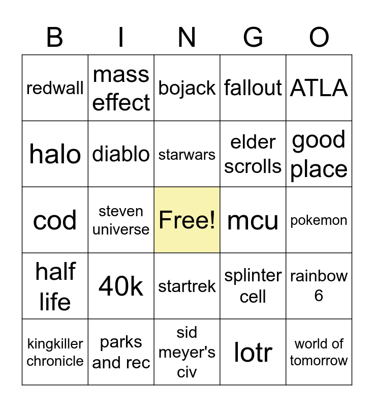 This bingo card has a free space and 24 words: 40k, parks and rec, starwars, kingkiller chronicle, ATLA, redwall, halo, mass effect, mcu, startrek, elder scrolls, cod, splinter cell, rainbow 6, diablo, lotr, pokemon, bojack, good place, steven universe, world of tomorrow, half life, fallout and sid meyer's civ.