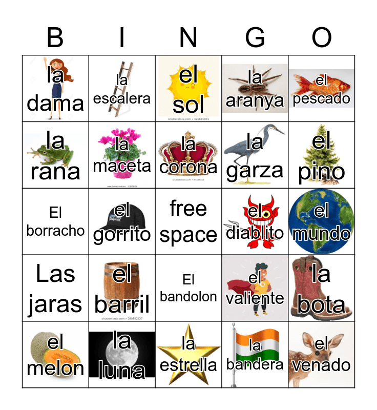 This bingo card has 43 images, a free space and 53 words: la campana, el venado, el cazo, la bandera, el barril, la botella, la escalera, la mano, la rana, el arpa, la maceta, el pajarito, la bota, el valiente, el nopal, el melon, la corona, el diablito, el tambor, el pescado, el gorrito, el corazon, la garza, la dama, la sirena, la luna, el musico, la palma, la pera, el pino, el gallo, la rosa, el alacran, el camaron, la calavera, el soldado, la aranya, la estrella, el sol, el arbol, el paraguas, la sandia, el mundo, El catrin, La muerte, El bandolon, El cello, El cotorro, El borracho, Las jaras, El apache, El cantarito and La chalupa.