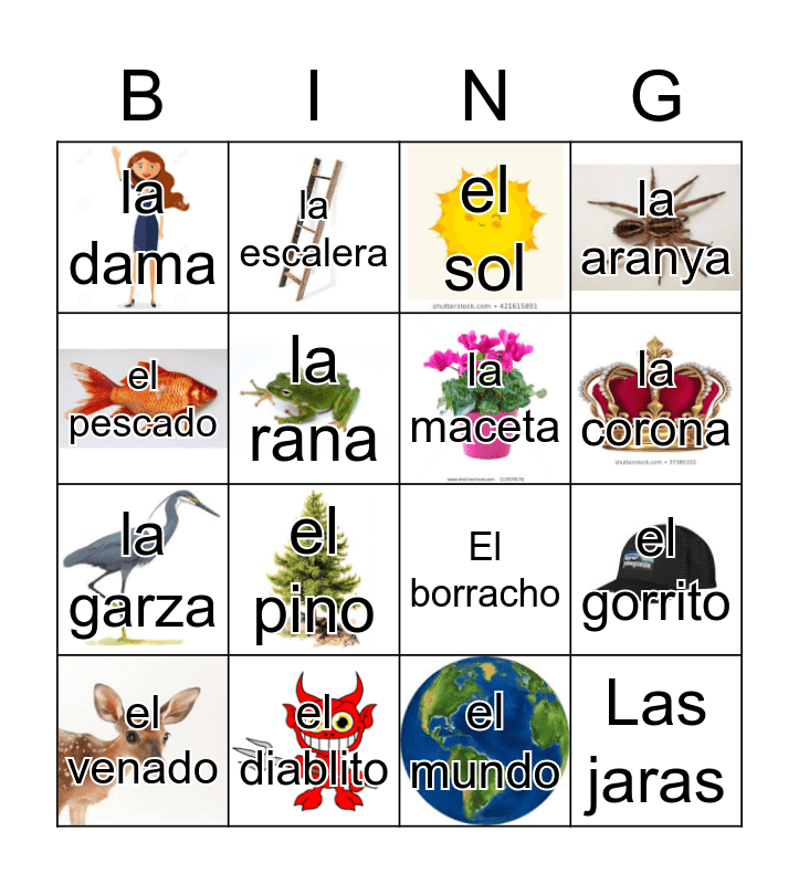 This bingo card has 43 images and 53 words: la campana, el venado, el cazo, la bandera, el barril, la botella, la escalera, la mano, la rana, el arpa, la maceta, el pajarito, la bota, el valiente, el nopal, el melon, la corona, el diablito, el tambor, el pescado, el gorrito, el corazon, la garza, la dama, la sirena, la luna, el musico, la palma, la pera, el pino, el gallo, la rosa, el alacran, el camaron, la calavera, el soldado, la aranya, la estrella, el sol, el arbol, el paraguas, la sandia, el mundo, El catrin, La muerte, El bandolon, El cello, El cotorro, El borracho, Las jaras, El apache, El cantarito and La chalupa.