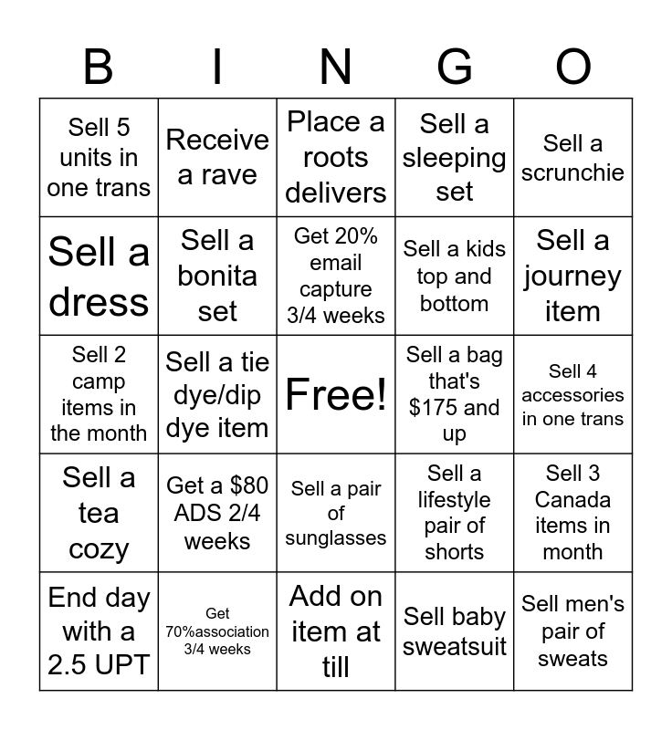 This bingo card has a free space and 24 words: Get a $80 ADS 2/4 weeks, Get 70%association 3/4 weeks, Get 20% email capture 3/4 weeks, End day with a 2.5 UPT, Sell a scrunchie, Sell 5 units in one trans, Sell a dress, Receive a rave, Sell a bag that's $175 and up, Sell a pair of sunglasses, Sell a kids top and bottom, Sell 2 camp items in the month, Sell a lifestyle pair of shorts, Sell 3 Canada items in month, Sell a bonita set, Sell baby sweatsuit, Sell 4 accessories in one trans, Place a roots delivers, Sell a journey item, Sell a tie dye/dip dye item, Sell men's pair of sweats, Sell a tea cozy, Sell a sleeping set and Add on item at till.