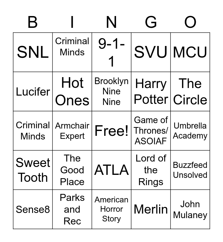 This bingo card has a free space and 24 words: The Good Place, Parks and Rec, Brooklyn Nine Nine, Sense8, MCU, SNL, Lucifer, Criminal Minds, Game of Thrones/ ASOIAF, ATLA, Harry Potter, Criminal Minds, Lord of the Rings, Buzzfeed Unsolved, Hot Ones, Merlin, Umbrella Academy, 9-1-1, The Circle, Armchair Expert, John Mulaney, Sweet Tooth, SVU and American Horror Story.