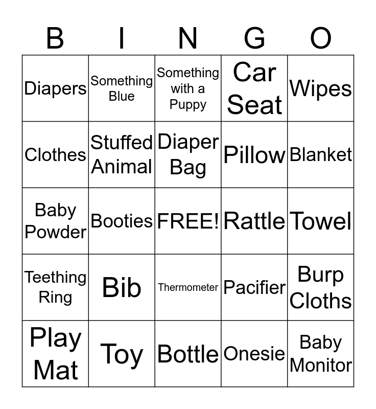 This bingo card has a free space and 26 words: Thermometer, Onesie, Diaper Bag, Toy, Wipes, Diapers, Clothes, Something Blue, Towel, Pacifier, Pillow, Baby Powder, Burp Cloths, Play Mat, Booties, Book, Car Seat, Teething Ring, Something with a Puppy, Baby Monitor, Blanket, Bottle, Rattle, Bib, Stuffed Animal and Bathtub.