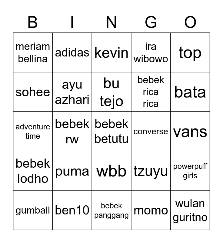 This bingo card has a free space and 24 words: puma, ben10, bu tejo, gumball, top, meriam bellina, sohee, adidas, converse, wbb, bebek rica rica, adventure time, tzuyu, powerpuff girls, ayu azhari, momo, vans, kevin, bata, bebek rw, wulan guritno, bebek lodho, ira wibowo and bebek panggang.