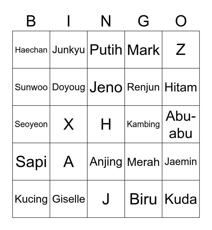 This bingo card has a free space and 24 words: A, Giselle, Jeno, Kucing, Z, Haechan, Sunwoo, Junkyu, Kambing, Anjing, Renjun, Seoyeon, Merah, Jaemin, Doyoug, Biru, Abu-abu, Putih, Hitam, X, Kuda, Sapi, Mark and J.