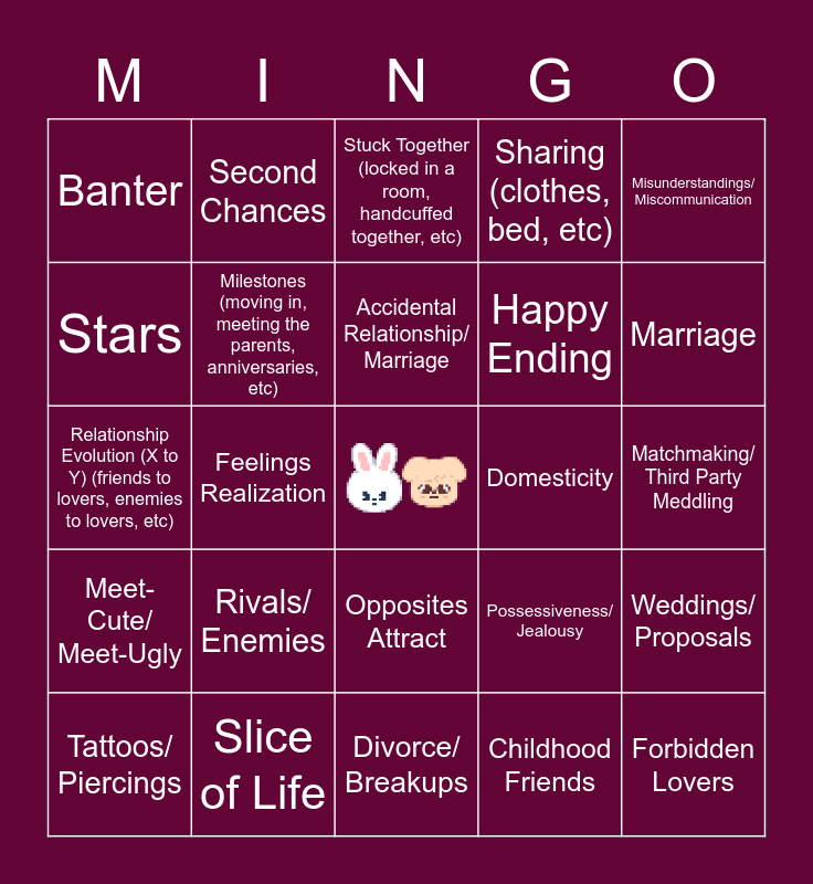 This bingo card has a free space and 24 words: Rivals/ Enemies, Slice of Life, Accidental Relationship/ Marriage, Tattoos/ Piercings, Misunderstandings/ Miscommunication, Banter, Stars, Second Chances, Domesticity, Opposites Attract, Happy Ending, Relationship Evolution (X to Y) (friends to lovers, enemies to lovers, etc), Possessiveness/ Jealousy, Weddings/ Proposals, Milestones (moving in, meeting the parents, anniversaries, etc), Childhood Friends, Matchmaking/ Third Party Meddling, Stuck Together (locked in a room, handcuffed together, etc), Marriage, Feelings Realization, Forbidden Lovers, Meet-Cute/ Meet-Ugly, Sharing (clothes, bed, etc) and Divorce/ Breakups.