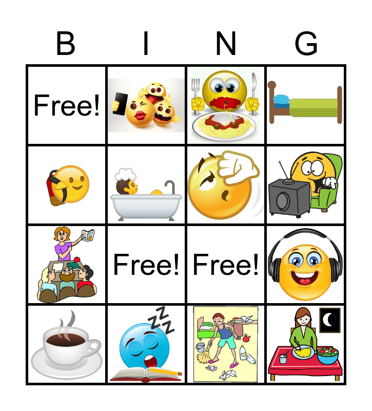 This bingo card has 13 images and 3 words: Free!, Free! and Free!.