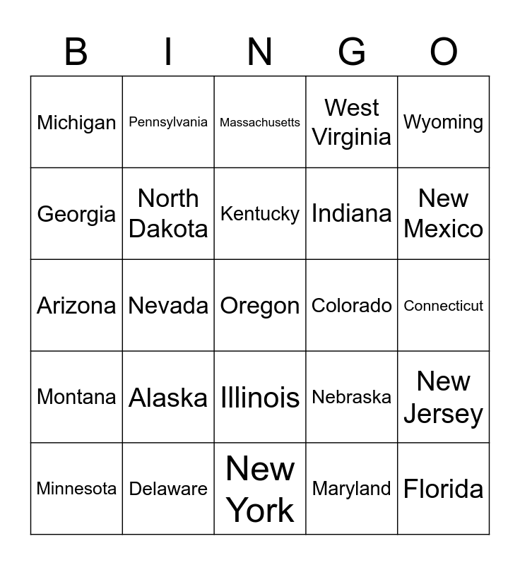 This bingo card has a free space and 24 words: Alaska, Delaware, Kentucky, Minnesota, Wyoming, Michigan, Georgia, Pennsylvania, Colorado, Illinois, Indiana, Arizona, Nebraska, New Jersey, North Dakota, Maryland, Connecticut, Massachusetts, New Mexico, Nevada, Florida, Montana, West Virginia and New York.