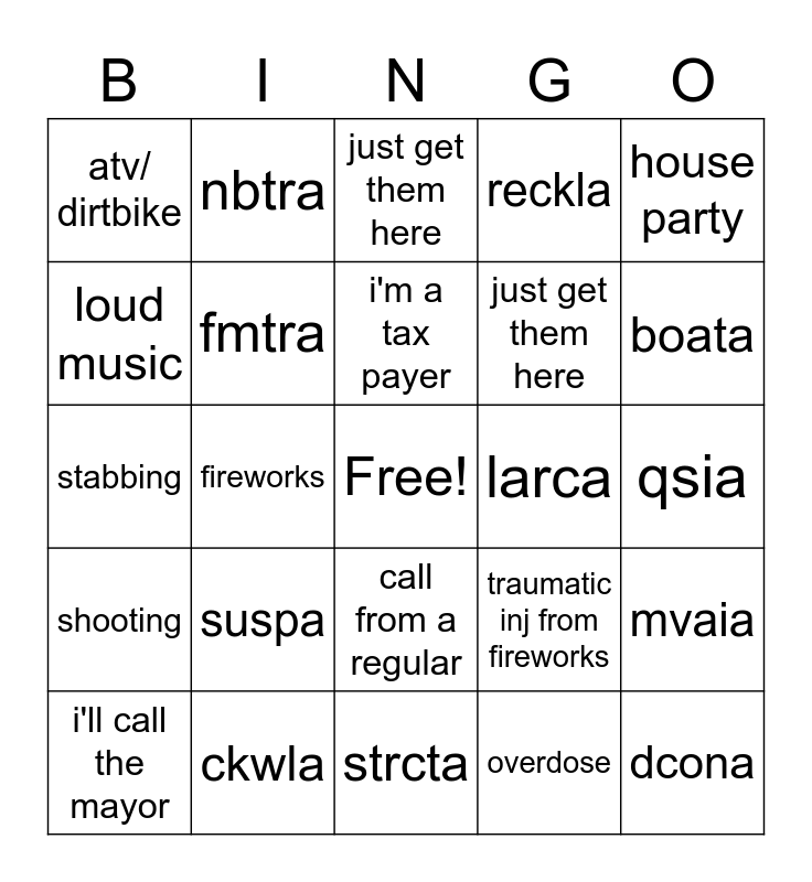 This bingo card has a free space and 24 words: suspa, ckwla, i'm a tax payer, i'll call the mayor, house party, atv/ dirtbike, loud music, nbtra, larca, call from a regular, just get them here, stabbing, traumatic inj from fireworks, mvaia, fmtra, overdose, qsia, just get them here, boata, fireworks, dcona, shooting, reckla and strcta.
