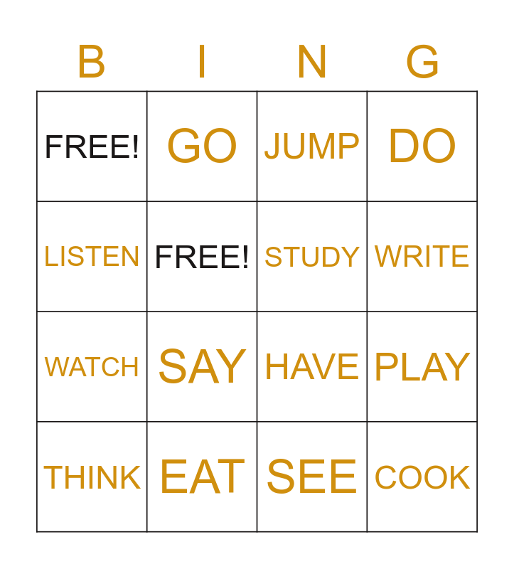 This bingo card has 16 words: EAT, PLAY, JUMP, FREE!, WATCH, GO, HAVE, SEE, LISTEN, FREE!, THINK, DO, SAY, WRITE, STUDY and COOK.