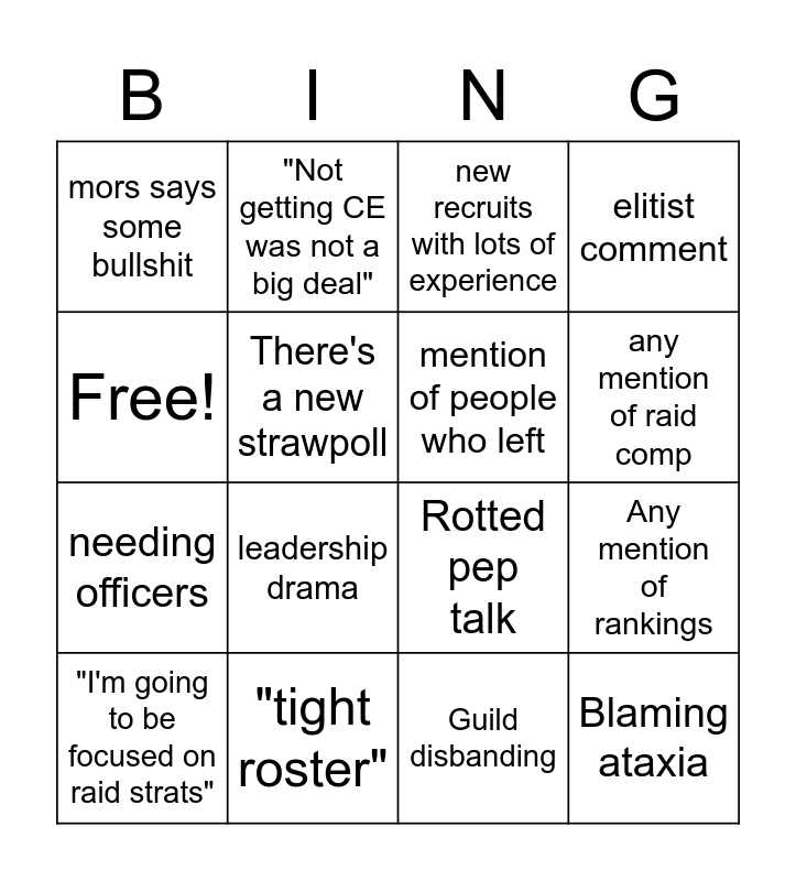 This bingo card has 16 words: "tight roster", Any mention of rankings, new recruits with lots of experience, mors says some bullshit, needing officers, "Not getting CE was not a big deal", Rotted pep talk, Guild disbanding, Free!, There's a new strawpoll, "I'm going to be focused on raid strats", elitist comment, leadership drama, any mention of raid comp, mention of people who left and Blaming ataxia.