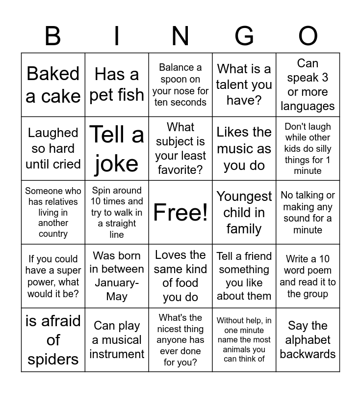 This bingo card has a free space and 24 words: Was born in between January-May, Can play a musical instrument, What subject is your least favorite?, is afraid of spiders, Can speak 3 or more languages, Baked a cake, Laughed so hard until cried, Has a pet fish, Youngest child in family, Loves the same kind of food you do, Likes the music as you do, Someone who has relatives living in another country, Tell a friend something you like about them, Write a 10 word poem and read it to the group, Tell a joke, Without help, in one minute name the most animals you can think of, No talking or making any sound for a minute, Balance a spoon on your nose for ten seconds, Don't laugh while other kids do silly things for 1 minute, Spin around 10 times and try to walk in a straight line, Say the alphabet backwards, If you could have a super power, what would it be?, What is a talent you have? and What's the nicest thing anyone has ever done for you?.