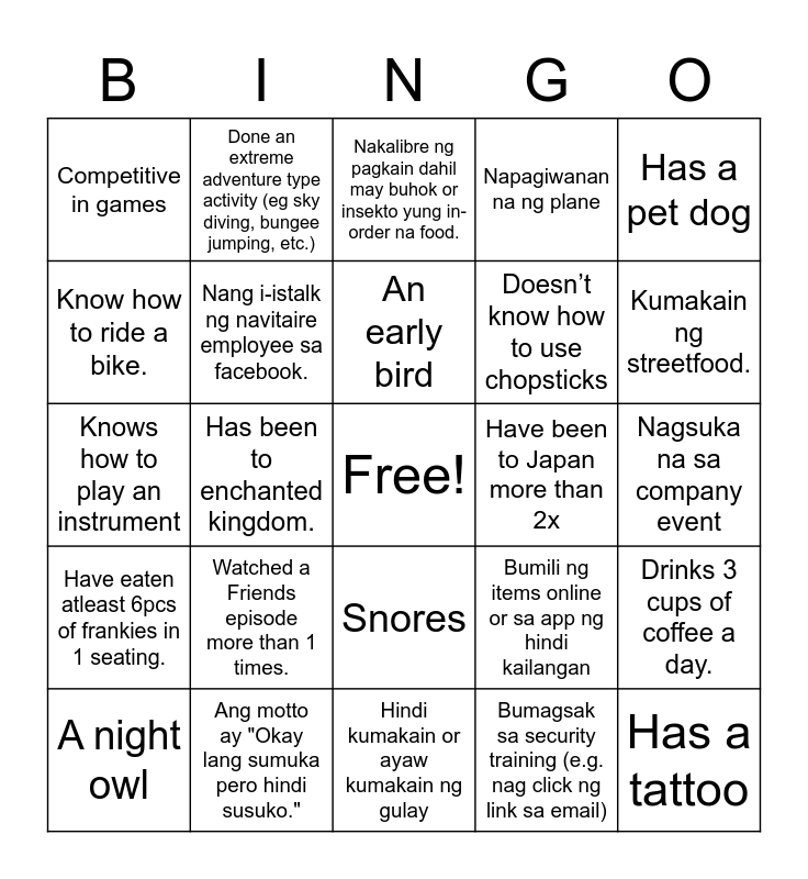 This bingo card has a free space and 24 words: Watched a Friends episode more than 1 times., Ang motto ay "Okay lang sumuka pero hindi susuko.", An early bird, A night owl, Has a pet dog, Competitive in games, Know how to ride a bike., Done an extreme adventure type activity (eg sky diving, bungee jumping, etc.), Have been to Japan more than 2x, Snores, Doesn’t know how to use chopsticks, Knows how to play an instrument, Bumili ng items online or sa app ng hindi kailangan, Drinks 3 cups of coffee a day., Nang i-istalk ng navitaire employee sa facebook., Bumagsak sa security training (e.g. nag click ng link sa email), Nagsuka na sa company event, Nakalibre ng pagkain dahil may buhok or insekto yung in-order na food., Kumakain ng streetfood., Has been to enchanted kingdom., Has a tattoo, Have eaten atleast 6pcs of frankies in 1 seating., Napagiwanan na ng plane and Hindi kumakain or ayaw kumakain ng gulay.