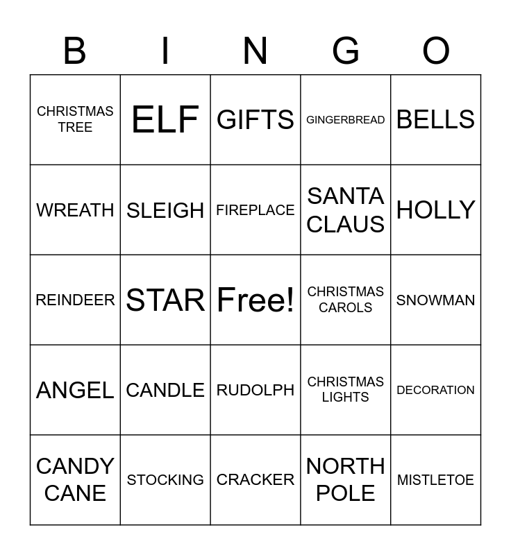 This bingo card has a free space and 24 words: CANDLE, STOCKING, FIREPLACE, CANDY CANE, BELLS, CHRISTMAS TREE, WREATH, ELF, CHRISTMAS CAROLS, RUDOLPH, SANTA CLAUS, REINDEER, CHRISTMAS LIGHTS, DECORATION, SLEIGH, NORTH POLE, SNOWMAN, GIFTS, HOLLY, STAR, MISTLETOE, ANGEL, GINGERBREAD and CRACKER.