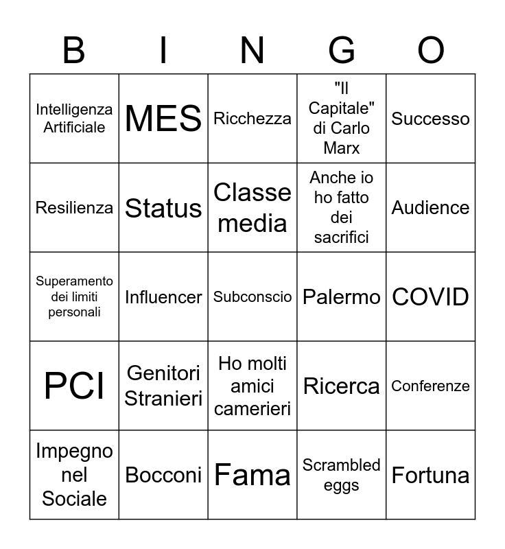 This bingo card has a free space and 24 words: Genitori Stranieri, Bocconi, Classe media, Impegno nel Sociale, Successo, Intelligenza Artificiale, Resilienza, MES, Palermo, Ho molti amici camerieri, Anche io ho fatto dei sacrifici, Superamento dei limiti personali, Ricerca, Conferenze, Status, Scrambled eggs, COVID, Ricchezza, Audience, Influencer, Fortuna, PCI, "Il Capitale" di Carlo Marx and Fama.
