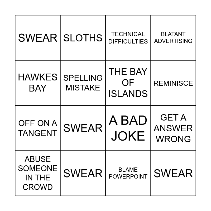This bingo card has 16 words: SWEAR, GET A ANSWER WRONG, TECHNICAL DIFFICULTIES, SWEAR, OFF ON A TANGENT, SLOTHS, A BAD JOKE, BLAME POWERPOINT, HAWKES BAY, SPELLING MISTAKE, ABUSE SOMEONE IN THE CROWD, BLATANT ADVERTISING, SWEAR, REMINISCE, THE BAY OF ISLANDS and SWEAR.